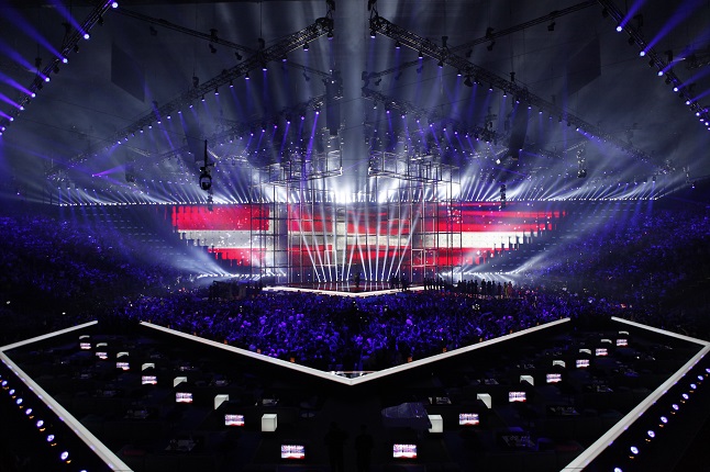 La labor le fue encomendada a Claus Zier, veterano diseñador de escenografías en la televisión danesa: «Al principio tenía otra idea para el escenario, más circular, con anillos y agua. Luego empezamos a trabajar con la idea del diamante del logo, y pensamos en un cubo. El espacio estaba condicionado por su función de antiguos astilleros. Todo lleno de acero. En el diseño del escenario, quise que el público sintiera esa especie de ‘adn’ de acero que tiene este lugar. Vi una foto antigua de la proa de un barco en construcción en esta nave, y eso fue lo que me inspiró para la forma definitiva.» En cuanto a la famosa green room, que este año ha estado en el centro del pabellón, «al principio quería que cada delegación nacional estuviera como en un cubo, pero nos dimos cuenta de que eso iba a quitar visibilidad al público, así que decidimos hacerla en forma de ángulo».